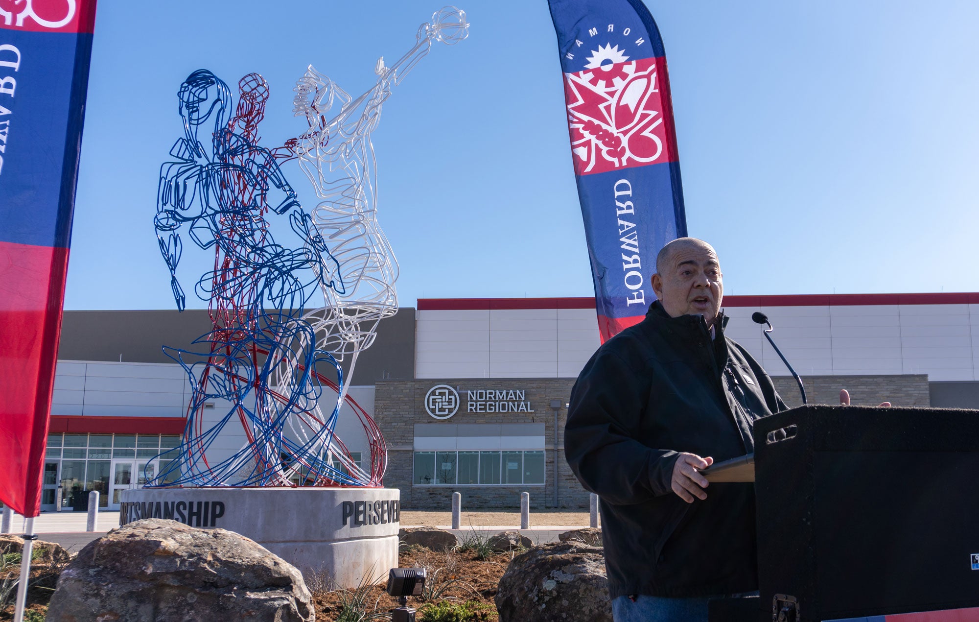 This sculpture is located in Norman, a college town in Oklahoma. “Elevate the Game ”represents the three sports of YFAC, the largest sports center in the state and stands 6 meters(20 feet) tall.