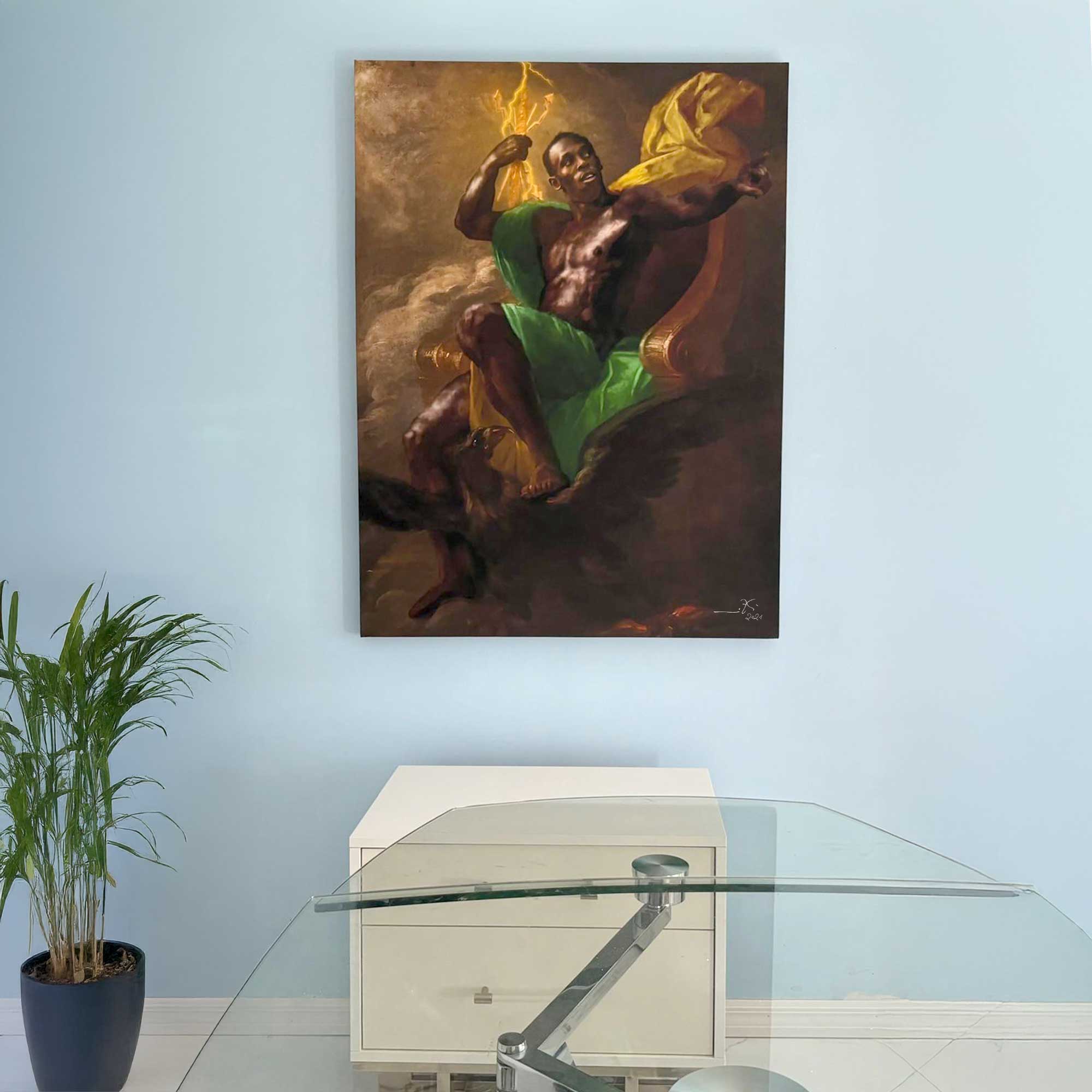 Hall of Fame revels in the mighty influence of athletes who have climbed to the highest honors. Painted as if self-aware of their own fame, wealth, and power, these athletes are matched with a traditional painting that exemplifies the essence of their prestige. Each original painting has a main element of portraiture that is utilized to replace the poser with the selected sport star, melding their representation into a background almost indistinguishable from the classic. Slight variations in the backgrounds are changed, replacing elements which signify key symbology in the original with items that create new meaning in relation to the replaced subject. Though the replacement of these elements create new meaning, interestingly, the original meaning adds another layer of depth to the interpretation of the works. The replacement itself contains context clues and connected symbolism.